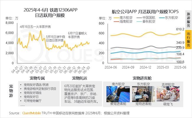 QuestMobile数据显示,2025年6月,旅游出行细分行业增速方面,用车服务和航班服务APP行业同比增幅均超20%,成为增长最快的细分行业。