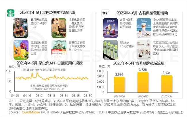 QuestMobile数据显示,4月28日,“五月天”与星巴克联名产品上线,星巴克APP当日流量飙升至93万,达到近期流量峰值,5月-6月,“五月的天”联名活动热度延续、非咖系列单品降价,带动星巴克APP流量持续攀升。二季度,古茗通过品牌联名、新品推出及入局咖啡赛道,6月私域流量达3134万。