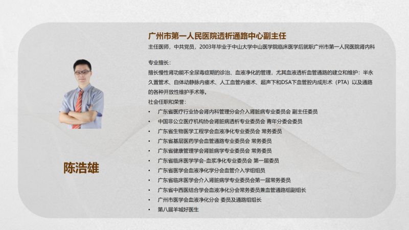广州市第一人民医院肾内科透析通路中心是国内最早由肾内科医生主刀开展血管通路手术的中心之一,是广东省医学会血液净化学分会介入肾脏病学组副组长单位、广州市医学会血液净化学分会血管通路学组组长单位。可开展全系列的透析通路手术,包括自体动静脉内瘘成形术、人造血管旁路移植术、长期导管的建立和维护、内瘘并发症的经皮血管腔内成形术、腹透漂管介入矫正术等。中心工作理念:为每一位透析患者建立合适的透析通路!