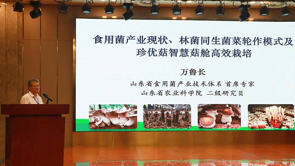 万鲁长作了《山东省食用菌产业现状、林菌同生菌菜轮作模式及珍优菇智慧菇舱高效栽培》主题宣讲。
