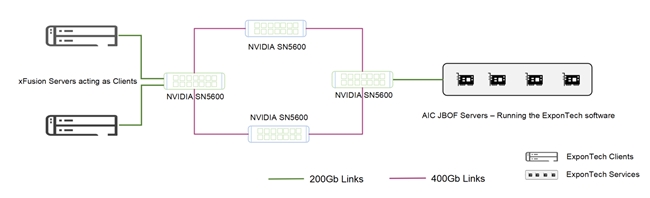 本次测试中,ExponTech与合作伙伴英伟达,Scaleflux, AIC深度合作,采用了软件,硬件均有显著创新的产品方案,目标是验证在AI场景下,采用新一代分布式存储软件栈驱动更加精简,高效的硬件方案,达到更高的性能密度,容量密度和更低的成本,同时在网络方面采用RoCE网络,验证其大规模组网能力以及整体存储方案的大规模扩展能力和并行访问能力。