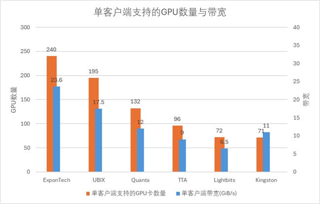 1、基于1个2U的存储节点以及1个客户端和2个客户端的测试结果显示,可以轻松满足模型ResNet-50的训练需求,单客户端能够支持的GPU卡的数量最高达到240块,带宽23.6GiB/s,在存储节点硬件采用DPU+JBOF, CPU和内存都不是很强(AI 控成本)的前提下,依然领先参与测试的所有厂商方案,位居世界第一。具体的测试结果数据如下: