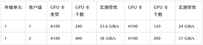 通过上述测试数据测算,ExponTech WADP使用一个2U的存储节点,在配置4个客户端的场景下,可以支持超过700块 A100 GPU训练卡和约400块 H100 GPU训练卡的训练需求,稳定提供70+GiB/s的带宽,逼近存储节点网络带宽极限。ExponTech WADP也可以支持扩展到更多的2U存储节点,形成大规模高性能存储集群,支持超大规模的AI训练场景。