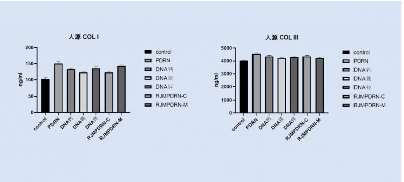 临床功效实证:临床前实验数据显示,BioPDRN 在促进胶原蛋白合成方面展现出显著优势:BioPDRN 对人源 I 型胶原蛋白的促进效果显著优于传统 PDRN 及 DNA 金属复合物;在小鼠 Ⅲ 型胶原蛋白合成实验中,其活性表现领先对照组,为皮肤修复、抗衰领域提供了 “数据可追溯” 的原料解决方案。