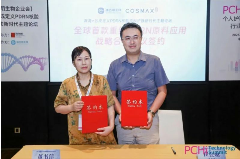 2025 年 8 月 19 日上午,在上海闵行宝龙艾美酒店金龙厅举办的 PCHI 峰会上,全球领先的美妆 ODM 企业科丝美诗与生物合成技术先锋瑞吉明联合举办 "全球首发 BioPDRN 签约发布会",正式向全球市场推出首款重组三文鱼 PDRN 原料。