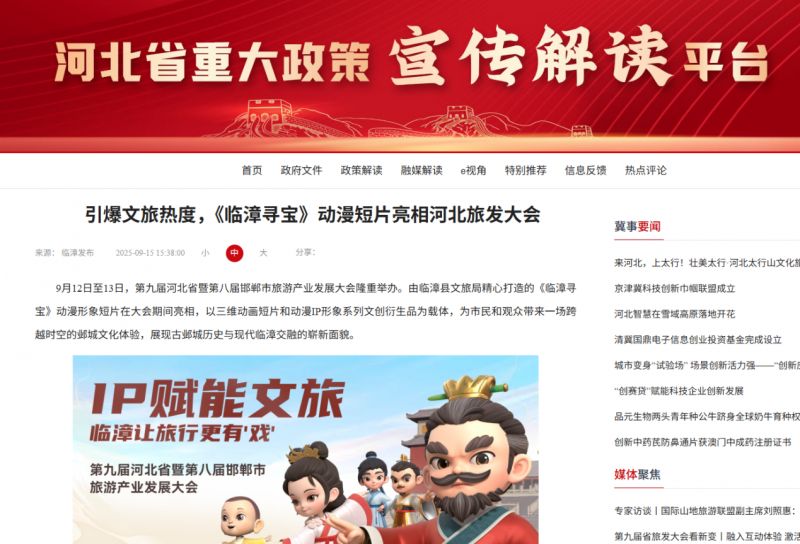 第九届河北省暨第八届邯郸市旅游产业发展大会于9月12日至13日成功举办。期间,由临漳县文旅局打造的文旅IP《临漳寻宝》以其创新的三维动画短片和丰富的文创衍生品,成为大会焦点,引发众多关注与热议。该IP不仅在线下展区吸引大量游客互动体验,更在线上获得新华网、中国日报、中国网、环球时报、中国发展网等多家权威媒体的重点报道,引爆抖音话题、微博话题,并登上微博同城热搜榜单,全网曝光超4000万,成为推动临漳文旅出圈的“新引擎”。