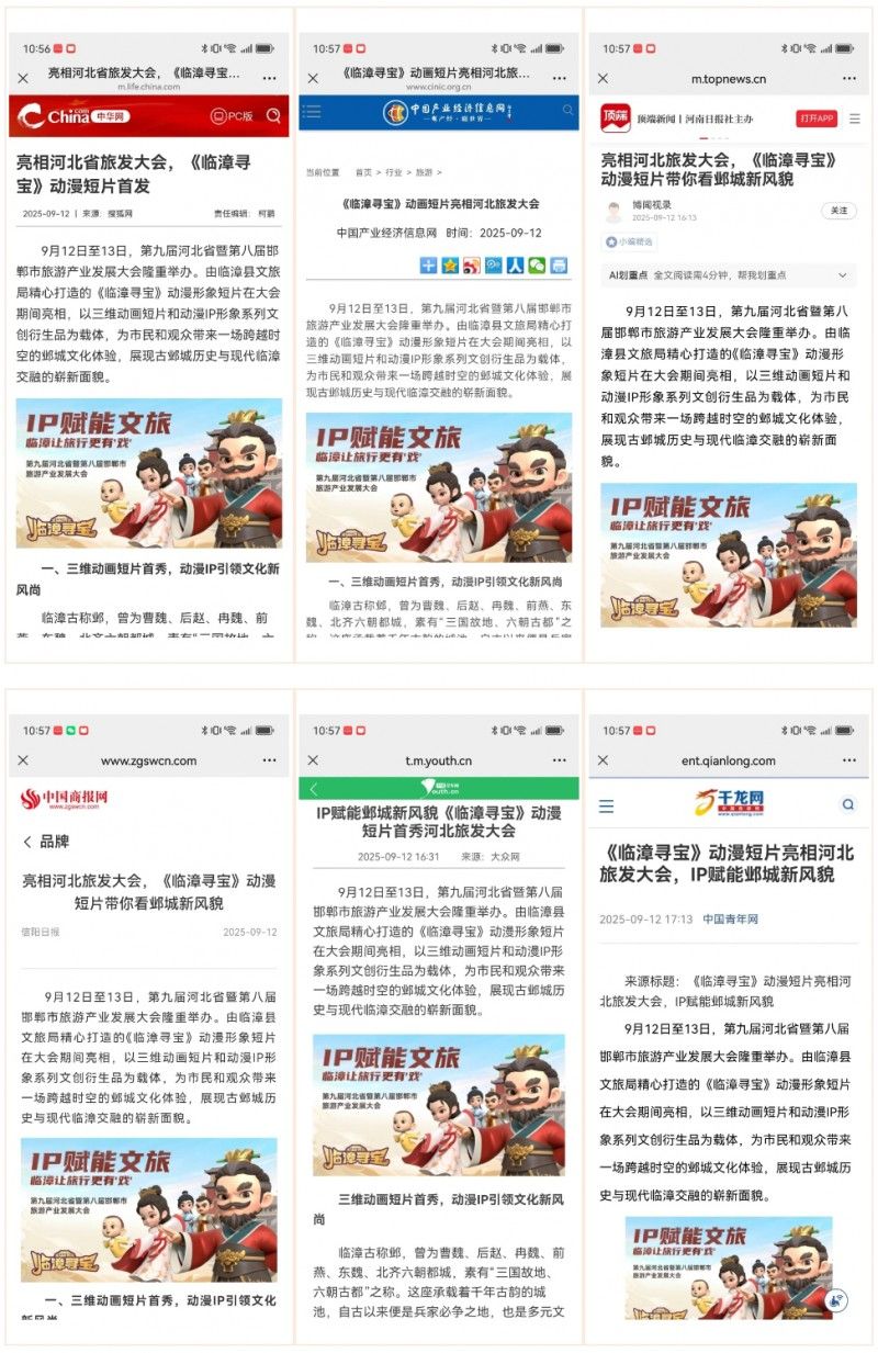 《临漳寻宝》IP自发布以来,便以其独特的历史文化底蕴和创新的现代表现形式吸引了众多关注。在本次旅游产业发展大会上,更是获得了广泛媒体支持。新华网、中国日报、中国网、环球时报、中国发展网、长城网、河青新闻网等数十家央级及河北省级权威媒体报道,同步在腾讯新闻、搜狐新闻、今日头条、百度百家等主流新媒体平台发布,覆盖新闻门户、视频平台、社交媒体等多维渠道,形成立体化传播矩阵。