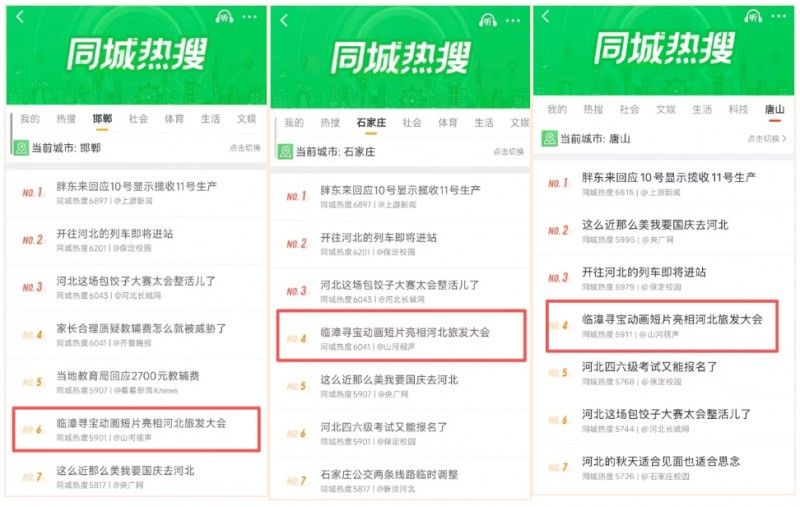 除此之外,《临漳寻宝》在抖音、微博、主流内容平台同样引发广泛讨论。相关微博话题#临漳寻宝动画短片亮相河北旅发大会# 上榜河北全省11个地级市微博同城热搜榜,话题阅读量2157.8万。相关抖音话题#临漳寻宝 获得超2000万曝光量。网友纷纷表示“被萌到了”“想去临漳打卡”。
