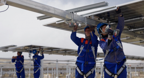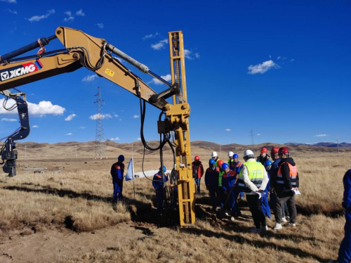 项目建设过程中,面临着高海拔、极寒天气带来的多重挑战。项目地处海拔4000米区域,平均气温低至-20℃,施工现场冻土层深厚,打桩作业难度极大,如同“在石头上插筷子”,精度和稳定性控制难度高,严重影响施工进度。为攻克这一难题,中建八局项目团队多次开展实验,最终决定选用PHC管桩代替传统灌注桩,在提升桩基稳定性的同时加快施工进度。同时,团队采用履带式高原打桩机,并搭配三维可视化管桩定位技术,大幅提升施工效率与精度。凭借科学的施工方案和高效的执行能力,项目团队仅用128天就完成了46299根基础桩、5427组支架与组件、13.86公里集电线路、1000公里低压直流线路、44公里低压交流线路、34台箱变、373台逆变器、1台站用变、1座汇集站以及7.35公里新建道路的建设任务,创造了高海拔地区新能源项目建设的高效典范。