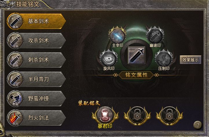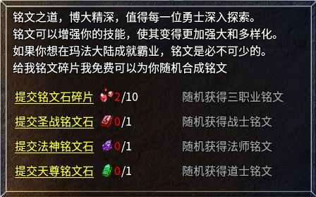 在角色栏可以看到,玩家可以装配三个铭文,第一个铭文槽默认开启,后两个需要消耗金币和对应职业的铭文石才能解锁。职业铭文石可以在精英怪和boss身上获取,也可以直接用铭文石碎片在合成大师NPC处合成。