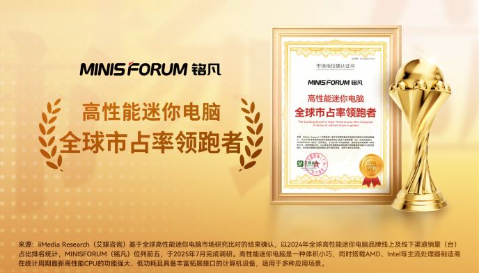 近期,铭凡获全球领先的新经济产业第三方数据挖掘和分析机构iiMedia Research(艾媒咨询)授予的“高性能迷你电脑全球市占率领跑者”“AI迷你电脑全球创新领导品牌”“AI迷你电脑行业第一品牌”“AI迷你电脑行业领先品牌”“高性能迷你电脑全球销量领先品牌”“高端迷你电脑消费者首选品牌”市场地位确认。