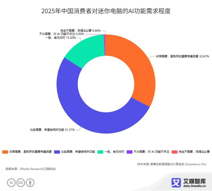 人工智能技术的融合正在成为迷你电脑行业最重要的技术趋势。2025年,迷你电脑若无AI算力,几乎失去上桌资格——iiMedia Research(艾媒咨询)调研数据显示,超八成的消费者对迷你电脑的AI功能非常需要,是购买的重要考量因素。