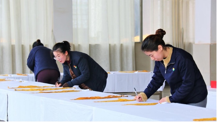在精进自身技能的同时,蔡青娜更注重管理经验的积累运用。在分选现场,总能看到她来回穿梭于各分选工作台的身影。她严格对照客户的选叶需求,仔细检查每一批烟叶的分选质量。每发现问题,从不轻易放过,而是耐心追溯根源,细致分析,与选叶工人亲切沟通,手把手示范讲解。每天工作结束后,她总会提前规划次日的烟叶调配量,预估每批次烟叶的分选进度,做到心中有数。她常说:“现场管理不是‘盯着人’,而是‘盯着细节’,把每个环节想在前、做在前,才能让工作更顺畅。”这句朴实的话语,道出了她严谨细致的工作态度。