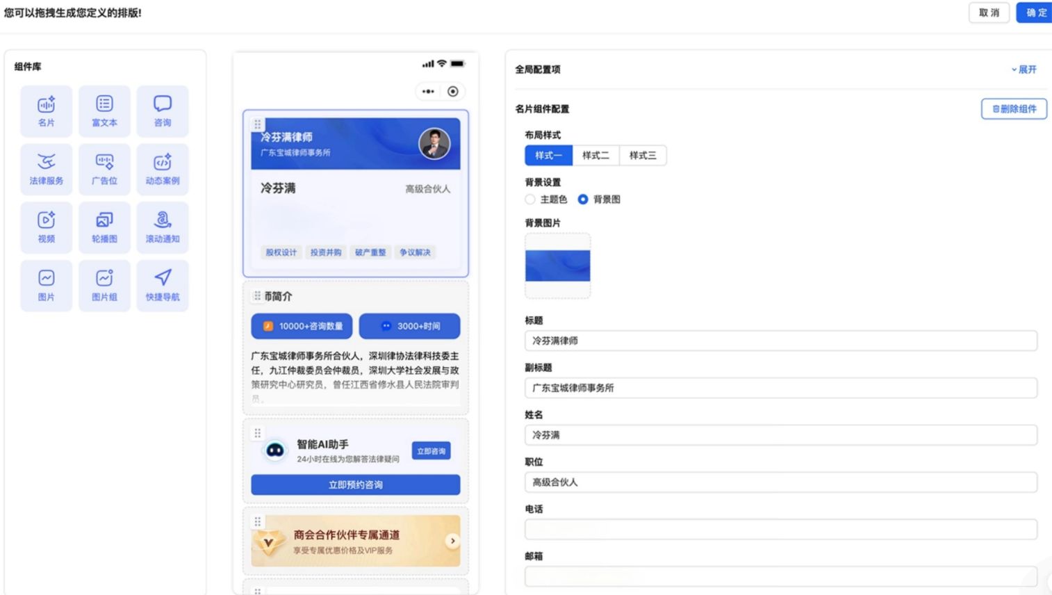 AI律师智能体致力于为律师打造个性化专业工作台,助力提升工作效能与品牌影响力。律师可根据自身业务领域和服务习惯,灵活配置工作界面布局与互动方式,结合AI助手、内容管理与智能营销工具,全面提升法律服务的响应速度、专业表现与客户触达能力,通过构建专属的数字法律助手,塑造具有影响力的个人专业品牌。