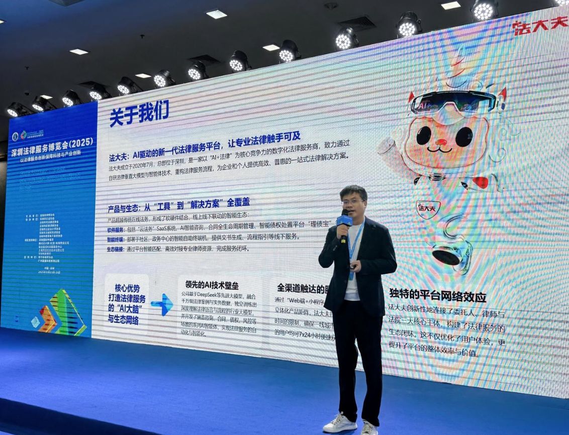 展会期间,法大夫创始人冷芬满在路演区开展了“AI重塑法律服务,让专业法律触手可及”主题分享,系统阐述了法大夫的技术路径与行业思考。他介绍,法大夫以DeepSeek为技术底座+自研法律垂类大模型,构建起“软件服务+智能终端+生态链接”的产品矩阵,已形成覆盖企业、个人、政府、律所、律师的全场景解决方案。
