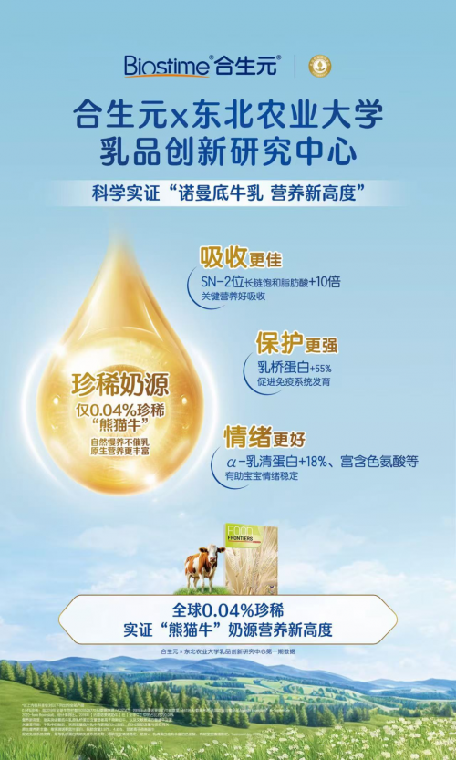 在深耕奶源品质的道路上,合生元还致力于深挖“熊猫牛”奶源的营养价值。近期,“乳品创新研究中心”首个诺曼底牛乳源研究成果在国际权威食品前沿杂志《Food Frontiers》重磅刊登。该研究显示:“熊猫牛”奶源SN-2位脂肪含量高,SN-2位长链饱和脂肪酸相比荷斯坦牛高10倍,更接近母乳脂肪构成,更丰富的保护力成分如乳桥蛋白+55%,以及更多乳源活性成分如α-乳清蛋白,色氨酸等,这些成分与宝宝的免疫提升、情绪稳定有关。“熊猫牛”奶源研究成果不仅科学展示了诺曼底“熊猫牛”奶源的营养优势,也推动了合生元奶粉在营养配方以及工艺上的不断精进,持续突破品质天花板。
