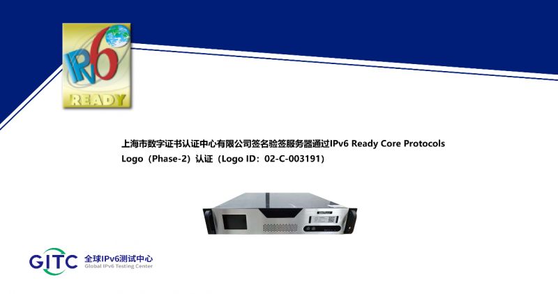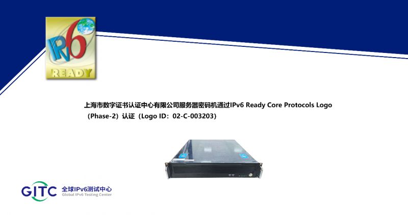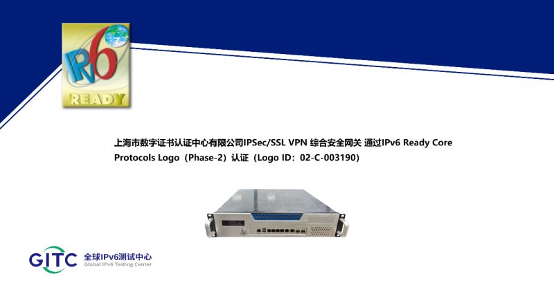 近日,上海市数字证书认证中心有限公司旗下IPSec/SSL VPN 综合安全网关、签名验签服务器、服务器密码机、云服务器密码机在下一代互联网国家工程中心-全球IPv6测试中心正式通过IPv6 Ready核心协议Phase-2测试,并荣获由国际组织IPv6 Forum颁发的IPv6 Ready Logo Phase-2认证证书。这标志着上述产品的IPv6核心协议实现已全面符合IETF RFC相关标准,其一致性和互通性得到了权威验证。