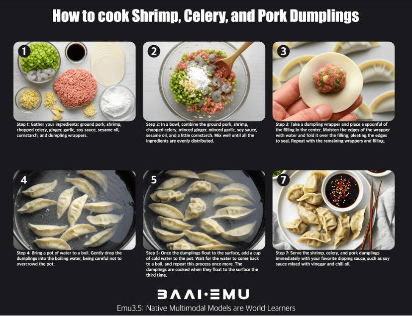 Emu3.5的多模态指导能力:输入“如何做芹菜饺子”,模型输出有步骤的图文指导
