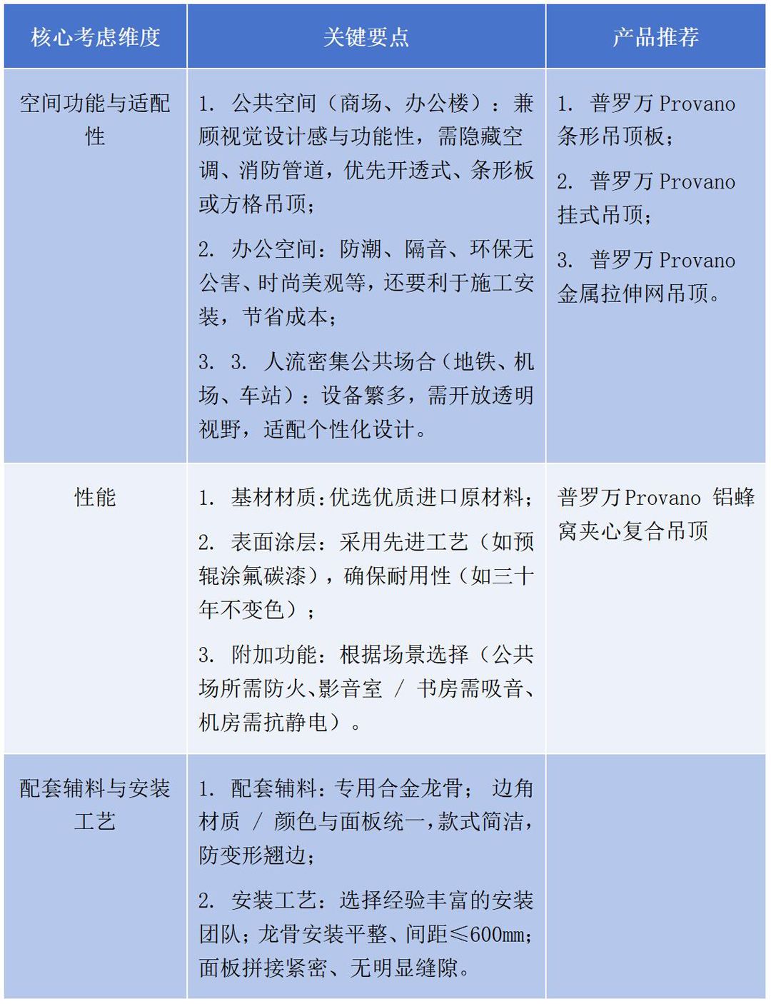 最后整理一个表格帮大家梳理一下挑选室内金属吊顶产品的要点,希望这篇文章能够帮助正在选择金属吊顶产品的你做出更专业的选择。