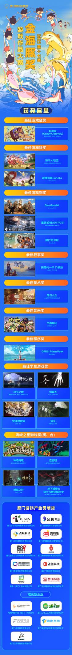 2025年10月31日上午,由厦门市人民政府主办,厦门国际动漫节组委会承办,厦门信息集团创新软件园管理公司等单位协办的第十七届“金海豚奖”颁奖仪式在厦门集美成功举办。本届大赛聚焦动漫、游戏、虚拟现实(VR)三大核心赛道,吸引了来自全球50多个国家和地区的数千件优秀作品参与角逐。包含《哪吒之魔童闹海》《守龙者》《时间之子》在内的72部动漫作品和18部游戏作品、18部VR作品脱颖而出,摘夺奖项!