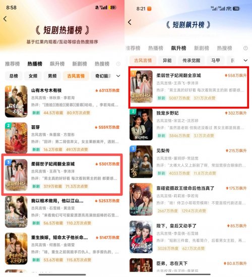 据红果平台“短剧热播榜”(基于观看量、互动量等综合热度排序)数据显示,该剧当前综合热度已突破5300万,在热播榜跻身榜单前三甲,在古风言情品类中表现尤为亮眼,飙升排行榜第一。作为一部全新上线的作品,《柔弱世子妃闹翻全京城》更收获了37.9万次收藏与71.3万次点赞,观众互动热情持续攀升。从热评反馈来看,剧集的角色塑造备受认可,“男主真的好好看、每次看到男主的剧都要感慨”等评论高频出现,足见演员与角色的适配度及观众认可度。