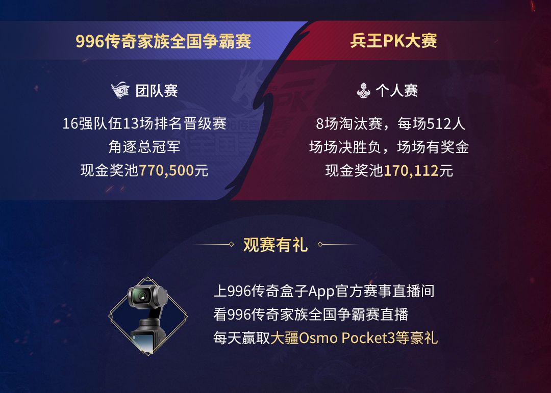 另外,没能抢到报名名额的普通玩家也可以在996传奇盒子APP的官方赛事直播间里全程观看996传奇家族全国争霸赛直播,还有机会每天赢取大疆Osmo Pocket3等丰厚礼品。