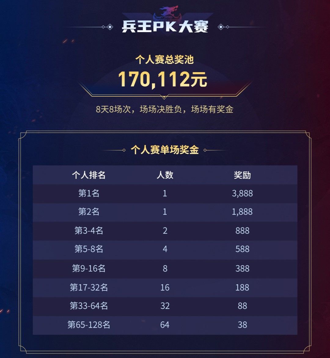 本届兵王PK大赛全民皆可报名参加,总奖池高达170112元,共举办8天8场,场场决胜负,场场有奖金。每场个人冠军的奖金为3888元,排名在第128名的选手也能拿到38元奖金,这意味着,选手仅需赢下两场比赛,便能确保获得奖金回报,这不仅是对实力的即时肯定,激励每一位参与者勇敢地向更高额的奖励发起冲击。