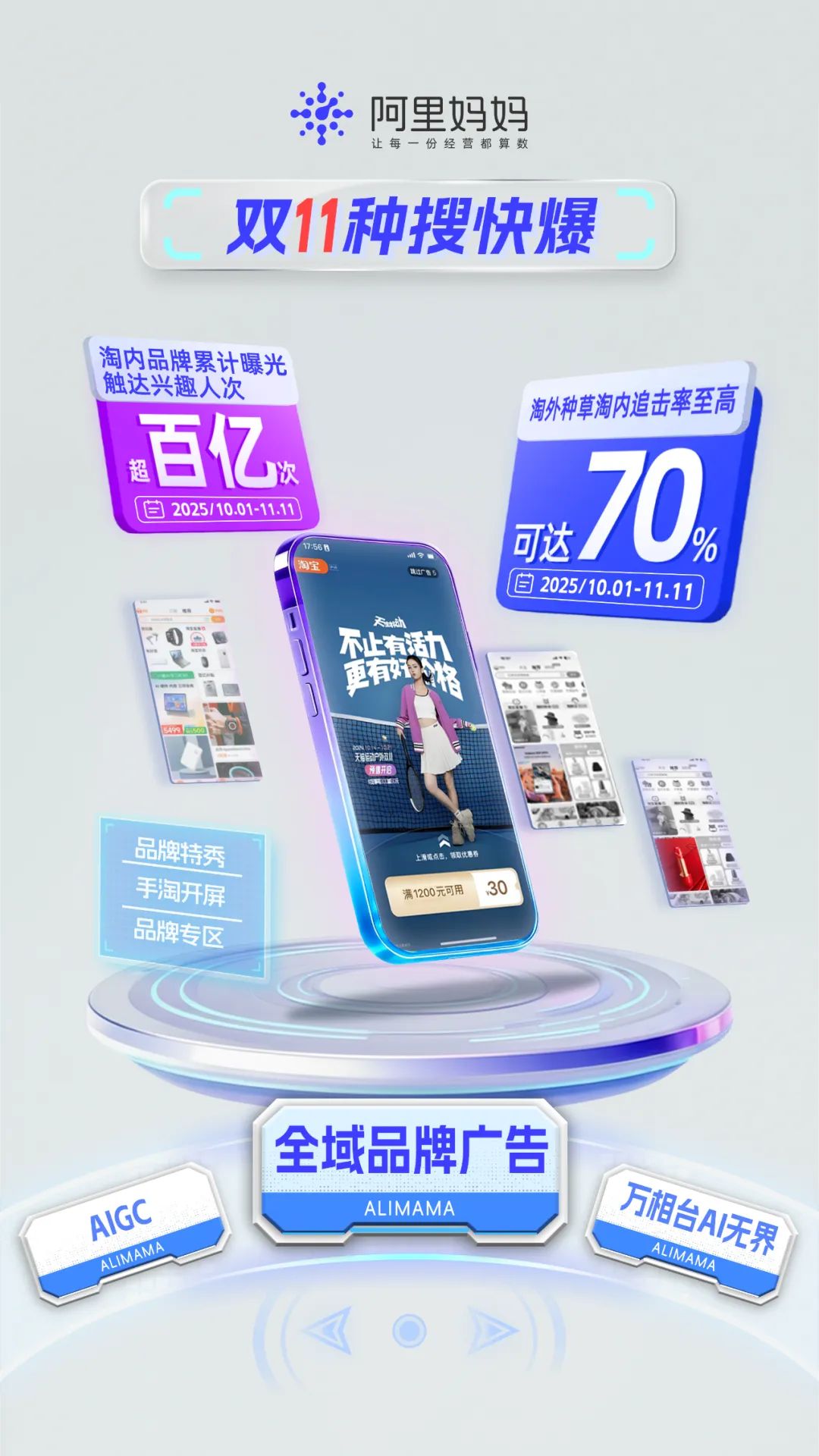 双11的战鼓仍在擂响,生意增长的窗口依然敞开!距离收官仅剩24小时,这是爆发的最后冲刺时刻!即刻加码投放阿里妈妈,把握品牌广告、万相台AI无界、AI创意生产的全线红利,让AI助你快投快赢,抢占流量最后一波峰值,实现双11完美收官!