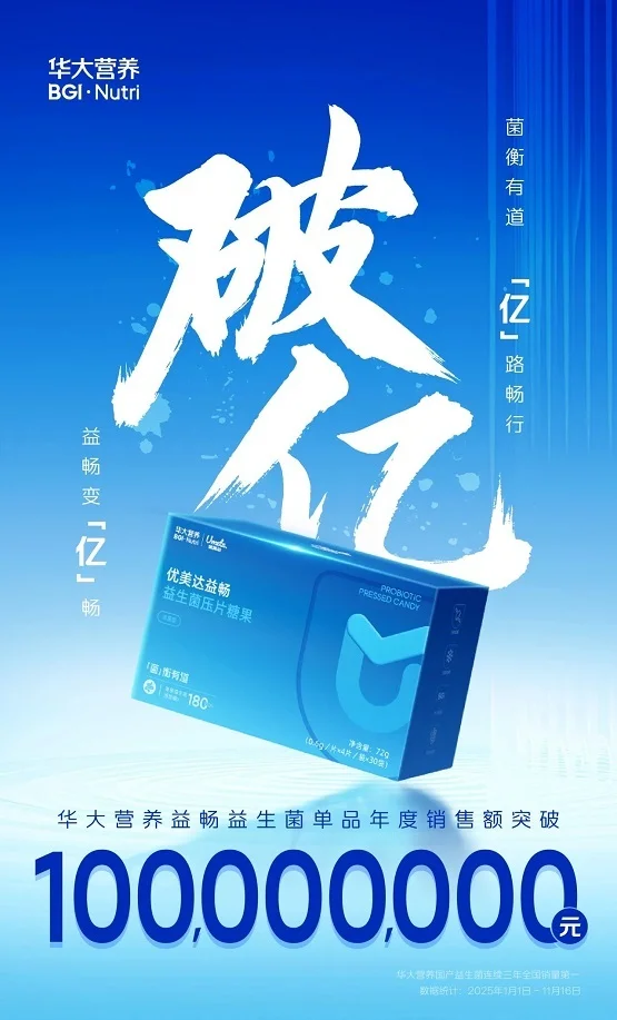 截至2025年11月16日,华大营养旗下优美达益畅益生菌单品年度销售额突破一亿元,成为改善便秘细分赛道中备受瞩目的国货产品。