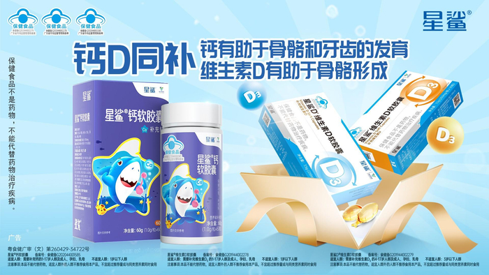 同样受宝妈群体青睐的,还有星鲨®维生素D软胶囊与钙软胶囊。两款产品均以高标准把控原料品质,维生素D能促进钙的高效吸收,钙则为骨骼发育提供“核心动力”,二者协同形成“1+1>2”的营养效应,上市多年始终保持良好口碑。