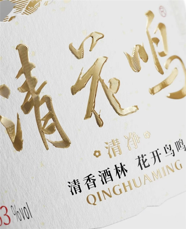 为此,柏星龙以“白酒里的一股清流”为核心理念,致力于打造一瓶能诉说自然语言的“清花鸣”。在视觉设计上,柏星龙打造了“花开鸟鸣”记忆锤:瓶标和细节元素提炼自清花鸣原产地生态,将杏花与飞燕融入瓶身设计,落花形成独特水纹视觉,再现产品生态感,让消费者从接触产品的第一瞬间,就能感受到“清香酒林,花开鸟鸣”的氛围。在标签细节上,瓶身笔触勾勒“地缸发酵、缓火蒸馏、陶缸储存”的传统酿造场景,背面插画采用版画风格,传统酿造底蕴跃然眼前,形成文化与产品的深度对话。