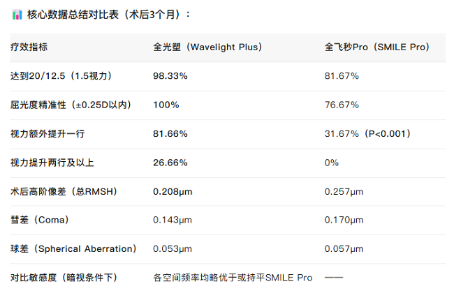 尤为引人注目的是,在视力额外提升方面,81.66%的全光塑患者术后视力比术前最佳矫正视力至少提升了一行,全飞秒Pro组这一比例仅为31.67%,统计学差异极其显著(P<0.001)。此外,全光塑组在术后高阶像差(总RMSH、彗差、球差)的数值上均低于对照组,意味着其在减少夜间眩光、光晕,提升视觉质量方面潜力更大。对比敏感度测试在暗视条件下,全光塑也略优于或持平于全飞秒Pro。