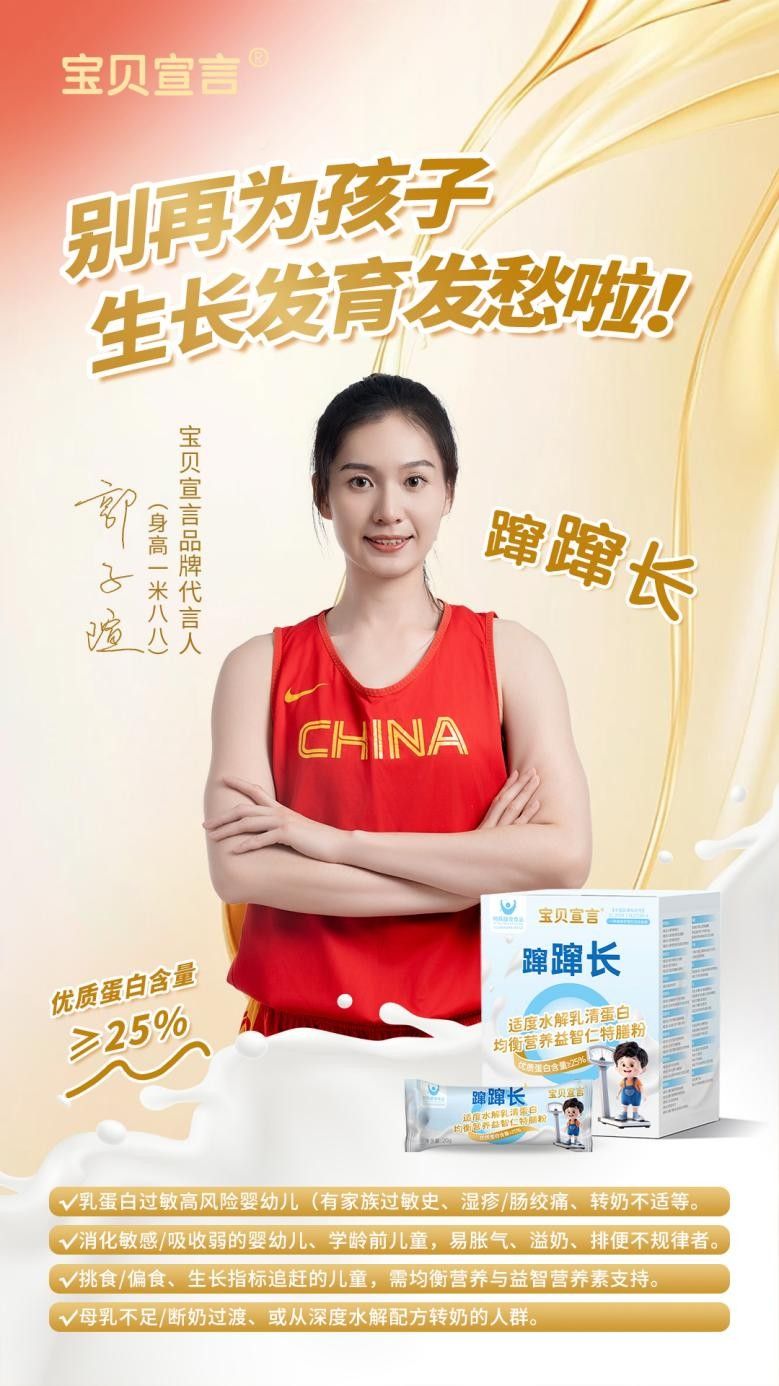 家长对孩子身高发育的焦虑,是母婴消费的核心痛点,而此次代言人选择堪称精准破局的神来之笔。郭子瑄作为中国职业女篮名将,手握WCBA全明星、女篮亚洲杯亚军、U16女篮亚青赛冠军等多项荣誉,更关键的是其1米88的高挑身形,自带“长高”说服力,成为最直观的产品名片。