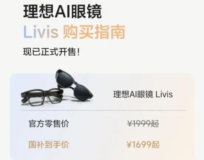 此外,理想 AI 眼镜 Livis 标准售价为1999元,限时补贴政策,最低入手价格为1699元。目前,该产品已在理想汽车 App 商城及京东商城上线销售,线下体验渠道包括理想汽车零售中心及蔡司授权眼镜店。