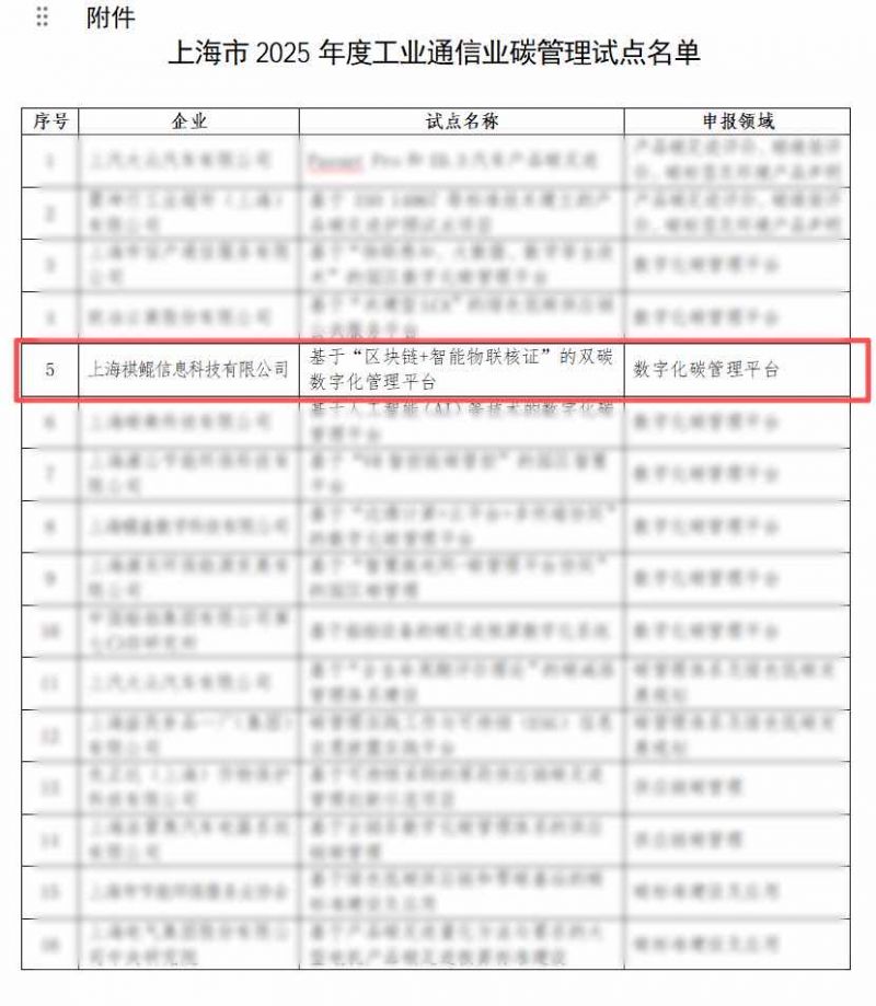12月10日,上海市经济和信息化委员会正式公布《2025年度上海市工业通信业碳管理试点名单》。上海祺鲲信息科技有限公司凭借「基于“区块链+智能物联核证”的双碳数字化管理平台」成功入选数字化碳管理平台试点项目,成为上海市首批碳管理试点示范企业之一。