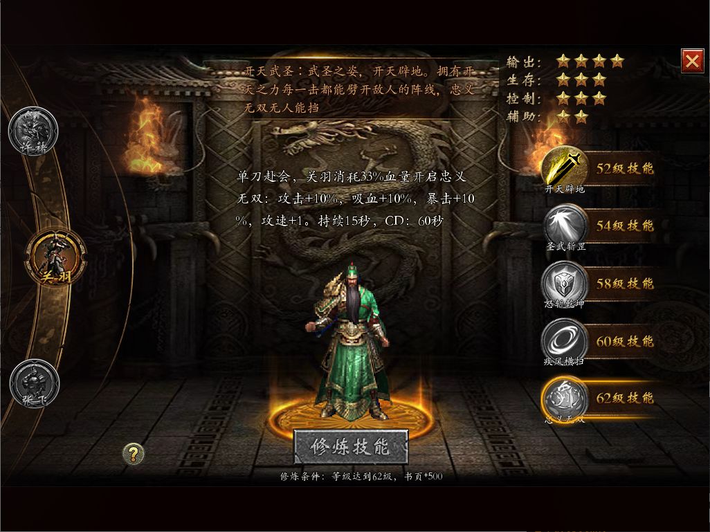 达到52级后,你将不再只是“战士”、“法师”或“道士”——你将化身张飞的勇猛,体验丈八蛇矛下敌人麻痹的绝望;你将继承赵云的忠勇,以最高攻击为代价换取超强的PK能力;你将手握吕布的方天画戟,将烈火与逐日剑法推向极致;你将如典韦般死战不休,血染征袍时爆发出惊人的力量;你将似许诸般横冲直撞,野蛮冲撞横扫八方;你将以关圣帝君的姿态,开启真正的无双模式。