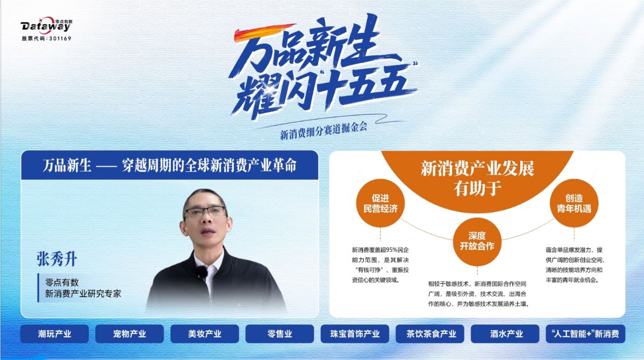 2025年12月17日,由零点有数主办的“万品新生,耀闪‘十五五’——新消费细分赛道掘金会”在线成功举办。活动通过多平台同步直播,吸引了来自消费产业、投资机构、研究学者及媒体代表的广泛关注。本次活动紧扣“十五五”规划中对高质量消费品供给的要求,探讨新消费产业革命趋势与机遇。零点有数新消费研究专家团首次公开亮相,深入解读潮玩、宠物、美妆、零售、珠宝、茶饮、酒水等细分赛道发展动态,并探讨人工智能等技术对消费场景的赋能路径,旨在洞察趋势、凝聚共识、赋能产业,共同探寻细分赛道中的增长机遇。