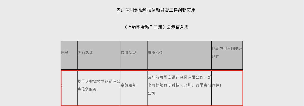 近日,微众银行与盟浪可持续数字科技(深圳)有限责任公司共同研发的“基于大数据技术的绿色普惠信贷服务”项目,已成功通过中国人民银行深圳市分行金融科技创新监管工具的项目评审与公示,正式入选新一批创新应用,标志着微众银行在“数据科技+绿色金融”的融合应用领域再次取得具有标杆意义的实践突破。