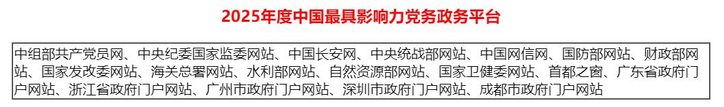 2025年,是我国“十四五”的收官之年,也是承前启后的关键之年。今年我们数字中国、数字政府建设进入全面深化新阶段,上述各党务政务平台网站以数字化转型为驱动,通过政府平台网站与政务新媒体深度融合与系统性创新,在提升治理效能、强化政务服务、优化营商环境、增强民生福祉、巩固主流舆论阵地等方面取得了显著成效,为党和国家重大战略实施提供了坚实支撑和有力保障。经评估专家组评议共同推荐上述党务政务网站为2025年度中国最具影响力党务政务平台(网站)!