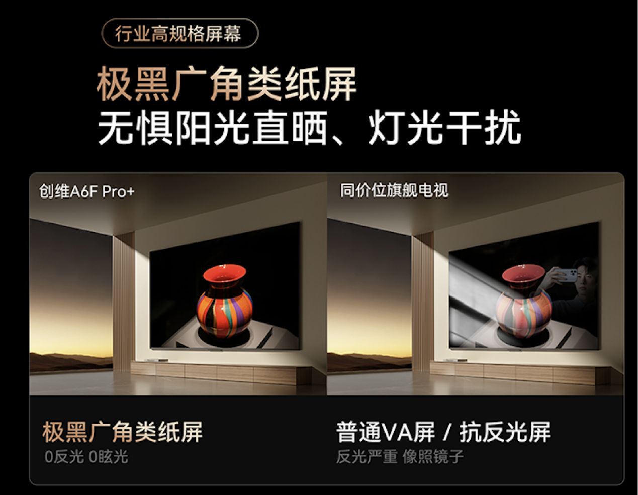 创维是行业首个推出不反光电视的品牌。创维A6F Pro+之所以被冠以“黑骑士”的称号,原因就在于屏幕采用了“LR抗反射涂层+AG25防眩光层+STW光学补偿层”三重技术,打造了一块“极黑广角类纸屏”,即使是透过客厅落地窗照进来的阳光落在电视上,也不会出现反光;此外还专门针对侧面视角做了色彩补偿,无论坐在什么位置,都能看到真实还原的影片效果,带来“0反光0眩光”的天然超高对比度。
