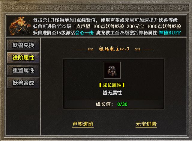 妖兽的成长路径极为亲民:每击杀一只怪物,不论普通小怪还是终极BOSS,均为妖兽提供1点经验。你也可以通过声望与元宝加速养成。获取方式更是多样——挑战对应BOSS直接掉落,或通过每日活动获取的“妖兽蛋”进行抽取。集齐5只相同妖兽,更能合成更高品阶,让成长每一步都充满策略与惊喜。