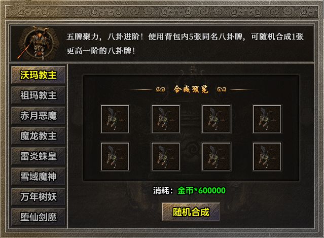 八卦牌主要通过挑战指定BOSS必定掉落获得(卦位随机),从此打宝目标明确,动力十足。多余的八卦牌无需担心占据背包,可存入专属仓库,更可5张同卦位、同品质合成更高一阶的随机八卦牌,让每一份努力都不被浪费。