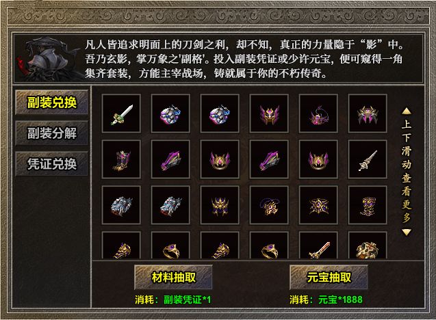 本服的“副装系统”可谓拥有颠覆性创新。品质由低到高可分为神秘、锋芒、狂骨、傲视,单件属性或许低调,但当你集齐同一品质的剑甲或装备套装时,将激活强大的属性光环——剑甲套装专注伤害(攻击伤害、PK增伤、穿透),装备套装强化生存(伤害减免、PK减伤、总血量)。
