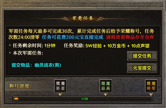 还有“百草淬体” 、“军需任务”也是助力成长的有力阶梯,前者通过消耗草药概率提升属性,达成“百炼圣体”称号;后者每日完成30次即可荣获“猎魔将军”称号,奖励丰厚节奏自如,诚意满满犒劳玩家老铁。