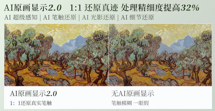 此外,创维A7H系列升级搭载了“AI原画显示2.0”技术,在识别到画作时,不仅能从笔触、光影、细节三个方面增强显示,还能通过感知环境光线的细微变化,进一步调教显示效果,使观感更加通透和立体,处理精细度较上一代提升32%,1:1还原画作真迹。