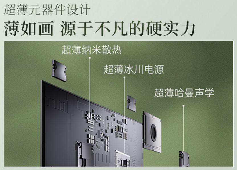 而为了让机身更加纤薄,创维重构了多个内部关键模块,在创维A7H系列上配备了超薄纳米散热、超薄冰川电源、超薄哈曼声学、超薄AI控光,以及第四代酷冷散热系统。极简设计与超薄机身相结合,实现了惊艳的“超薄画框式机身”,可以做到100%无缝贴墙安装,契合不同家装风格。