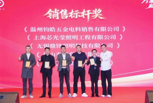 ▲在雷士照明五金流通渠道大商经销商大会上,杨仁桂(左二)获“销售标杆奖”