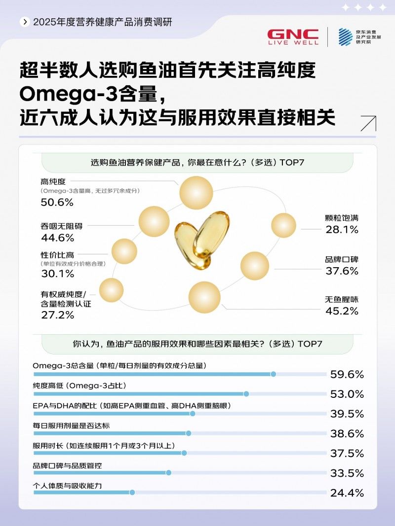 调研显示,2025年有51%的消费者购入了鱼油产品,同时,高纯度Omega-3成为超半数人选购鱼油产品时的第一关注点,还有59.6%的消费者认为,鱼油的服用效果与Omega-3总含量直接相关。