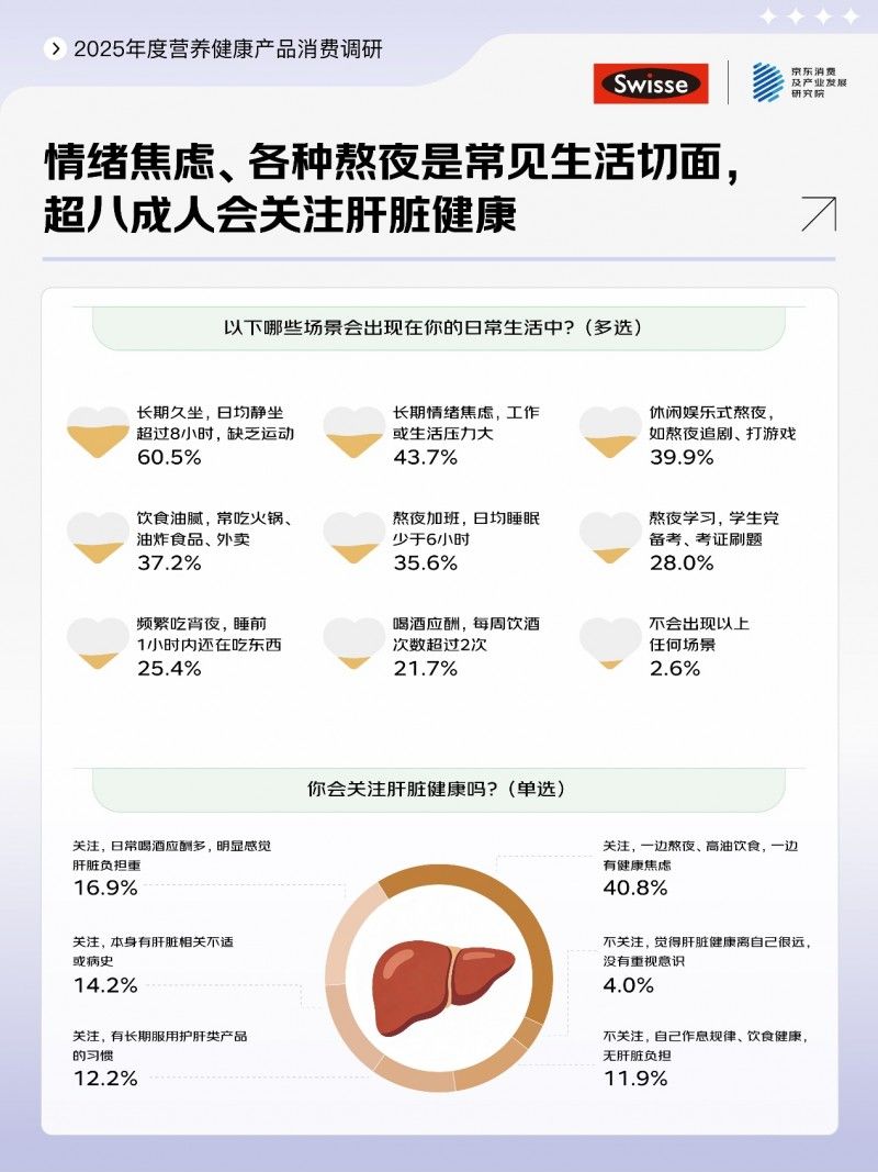 Swisse斯维诗指出,2025年除了传统熬夜加班人群购买护肝片外,熬夜带娃的奶爸奶妈们,为保持照料孩子的充足精力,也开始重视肝脏养护;除了商务应酬较多的职场精英常备护肝片以外,喜爱小酌的消费者也会主动选择护肝片。