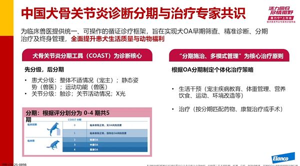 随着行业对犬骨关节炎的关注提升,建立统一规范的诊疗理念,已成为推动行业进步的重要课题。今年,多位专家起草的《犬骨关节炎诊断分期与治疗专家共识》正式落地,为临床诊疗提供明确参考,也标志着犬骨关节炎慢性疼痛规范管理迈出关键一步。刘秀丽副秘书长指出,宠物诊疗正向专科化、标准化迈进,本次中国兽医协会联合礼蓝与行业专家推动共识落地,将有助于完善国内犬骨关节炎诊疗和健康管理体系,指导临床提升诊疗效果和动物福利水平。同时,潘庆山主任委员强调,专家共识结合礼蓝推出的利物浦犬骨关节炎问卷(Liverpool Osteoarthritis in Dogs,LOAD)与犬骨关节炎分期工具(Canine OsteoArthritis Staging Tool,COAST),为临床带来了清晰的诊断分期标准和可直接落地的管理方案,让患犬可以获得更及时、更精准的治疗。礼蓝动保大中华区总经理陆智斌表示,礼蓝深耕宠物健康业务,持续推出重磅新品,同时赋能客户开展专科项目,助力合作医院提升综合服务水平。普力宁®进入中国市场,不仅是新产品上市,更是理念、工具与管理体系多维协同完善的重要起点。